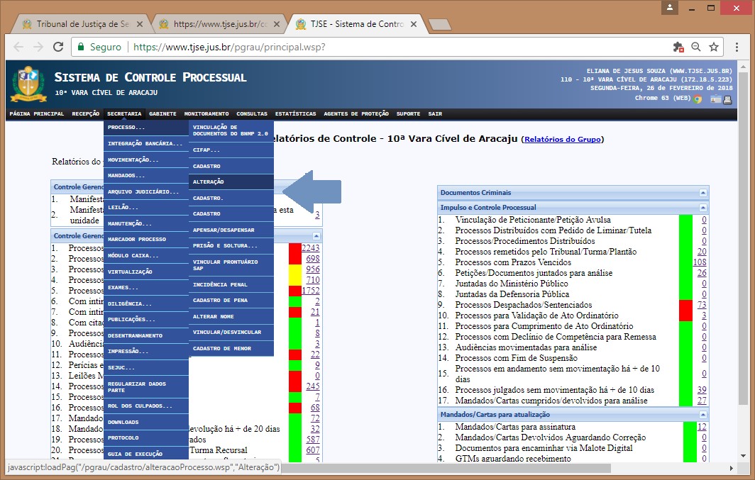 1º. Acessar o menu 'Secretaria >> Processo >> Alteração' ou a página de Consulta Processual, clicando no link de movimentação rápida. Ver figuras abaixo.