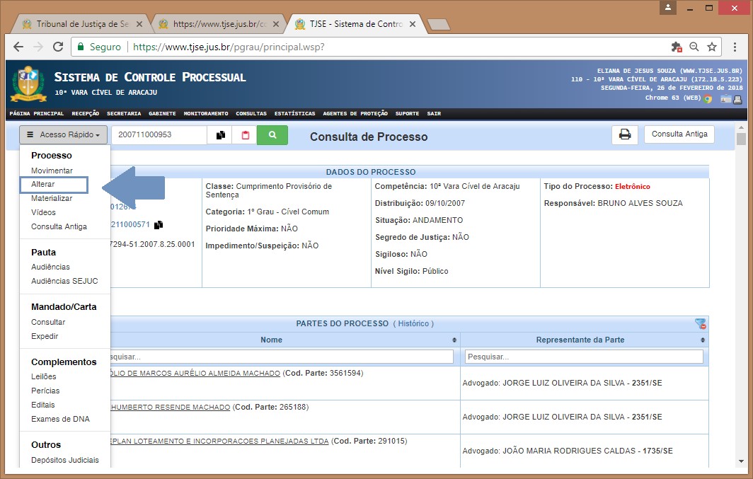 No TJSE, o cadastro de partes é unificado, ou seja, cada parte registrada recebe uma numeração própria na base de dados, um código específico (ver figura 2 acima). A alteração nos dados do processo, com inclusão e exclusão de partes/advogados, poderá ser realizada por qualquer servidor da Secretaria (menu: 'Secretaria >> Processo >> Alterar Nome'). A alteração no nome da parte na base de dados somente é permitida aos usuários 'Escrivão/Diretor de Secretaria' e 'Juiz', com a inserção no SCP da justificativa da alteração, sendo esta efetivada em todos os processos judiciais do Estado aos quais a parte responde.