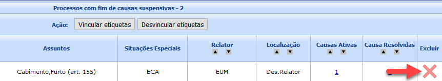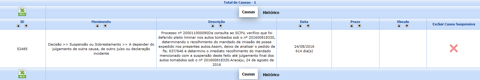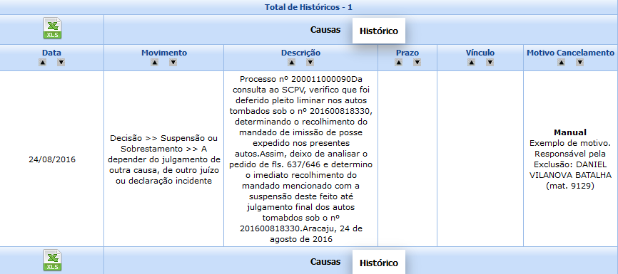 Confirmada a exclusão, a causa deixará de constar na aba "causas" e passará a constar na aba "histórico". Deve-se perceber que, na coluna "motivo de cancelamento", constam as informações do motivo especificado e do usuário que realizou a resolução. Nos casos de resolução automática, o motivo que ensejou a resolução aparecerá na mesma coluna "motivo cancelamento". |