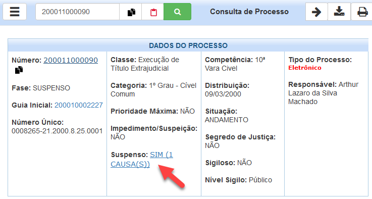 Pela consulta processual, o usuário deverá acessar a lista de causas suspensivas. Isso pode ser feito através do link na informação de suspensão, na grid "dados do processo". |