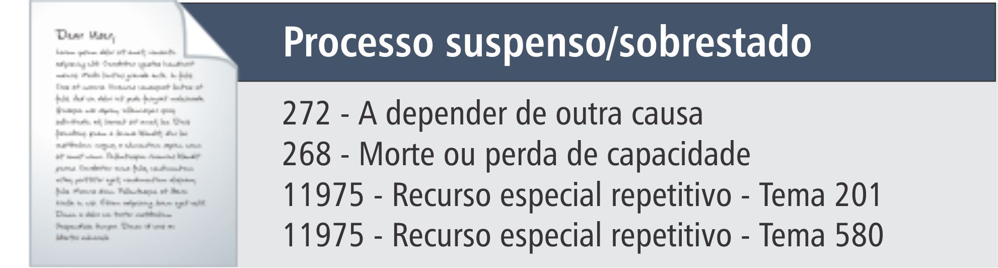 Pelo novo procedimento, portanto, sempre que for lançada a suspensão/sobrestamento de um processo, o sistema criará uma nova causa suspensiva. As causas suspensivas de um processo são controladas individualmente, conforme tratado nos tópicos seguintes.