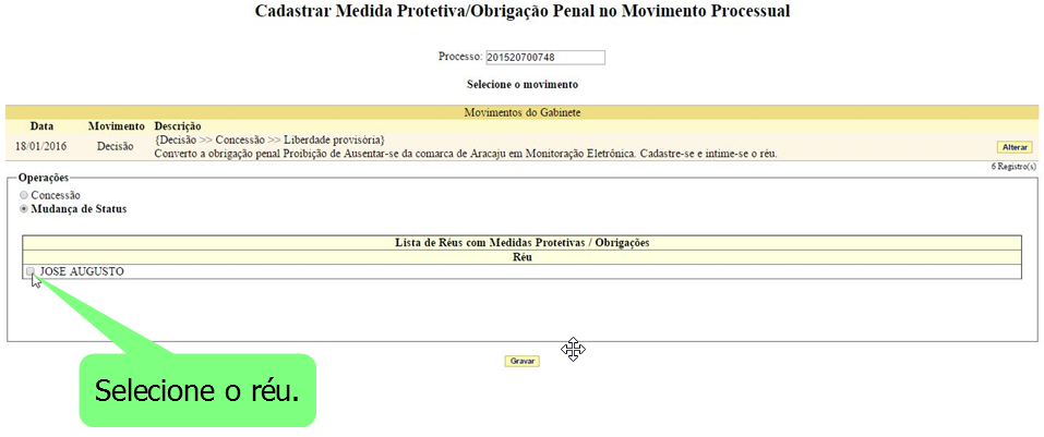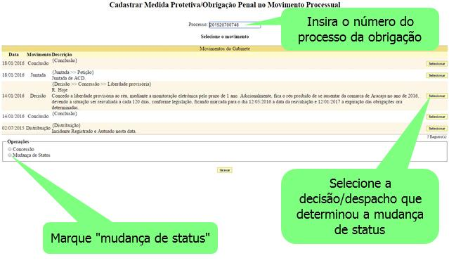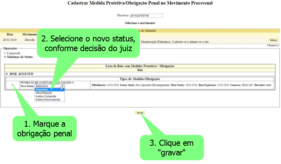Marque a obrigação penal cujo status será modificado. Em seguida selecione o novo status (“Ativa – regular”, Inativa – cumprida” ou “Inativa – Descumprida”) e clique no botão “gravar”. Após esta operação, o sistema exige a confirmação desta tarefa. Clique em “sim” na tela seguinte.