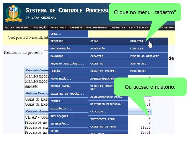 Há dois caminhos para mudar o status de uma obrigação penal. Através do relatório “CIFAP – Obrigações Penais para cadastrar” ou através do menu Secretaria >> Processo >> CIFAP >> Cadastro.