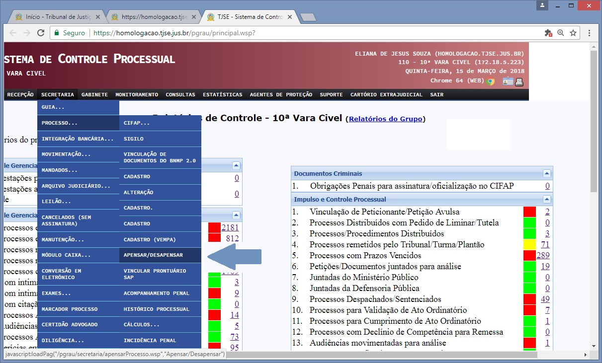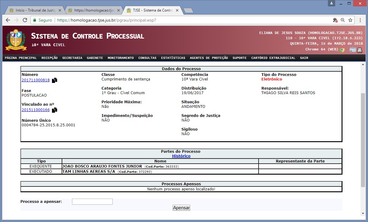 a) Apensamento no ato da distribuição Todos os processos tidos como dependentes para o Sistema de Controle Processual - SCP Virtual, ou seja, aqueles distribuídos ou redistribuídos por Dependência e cadastrados na Secretaria, encontram-se apensados fisicamente ou dentro dos autos principais, a exemplo da Execução de Sentença e da Reconvenção. b) Apensamento após a distribuição Há casos em que o liame de dependência de um feito a outro, em razão de conexão (art. 105 do CPC), somente é descoberto ou informado após a distribuição, resultando, assim, num comando judicial de apensamento. Nestas hipóteses, o apensamento é gravado no sistema através do menu: 'Secretaria>>Processo>>Apensar/Desapensar'. . Vale ressaltar que, embora o SPC Virtual permite o apensamento após a distribuição do feito, ainda não há no sistema a possibilidade de movimentação conjunta dos feitos apensados, necessitando que o usuário realize este procedimento nos processos individualmente. Exemplo: carga a advogado de processos apensos. Também não é possível visualizar os processos apensados, em bloco, nos relatórios de controles do sistema. |