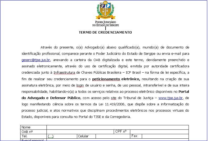 Artigo 170-D § 2º da Consolidação Normativa Judicial: "O cadastro do operador do direito para acessar o Portal do Advogado/Defensor Público poderá ser efetuado de duas formas: I – Através do comparecimento pessoal a qualquer Secretaria Judicial ou Recepção de Fórum do Poder Judiciário munido do Termo de Credenciamento devidamente preenchido, disponibilizado no portal do Advogado/Defensor Público, juntamente com a identificação profissional contendo o número da OAB. II – Através do e-mail geserc@tjse.jus.br, com o envio da carteira da OAB digitalizada e do termo de credenciamento, devidamente preenchido e assinado eletronicamente, através do uso de certificação digital, emitida por autoridade certificadora credenciada junto à Infraestrutura de Chaves Públicas Brasileira – ICP Brasil – na forma de lei específica...".