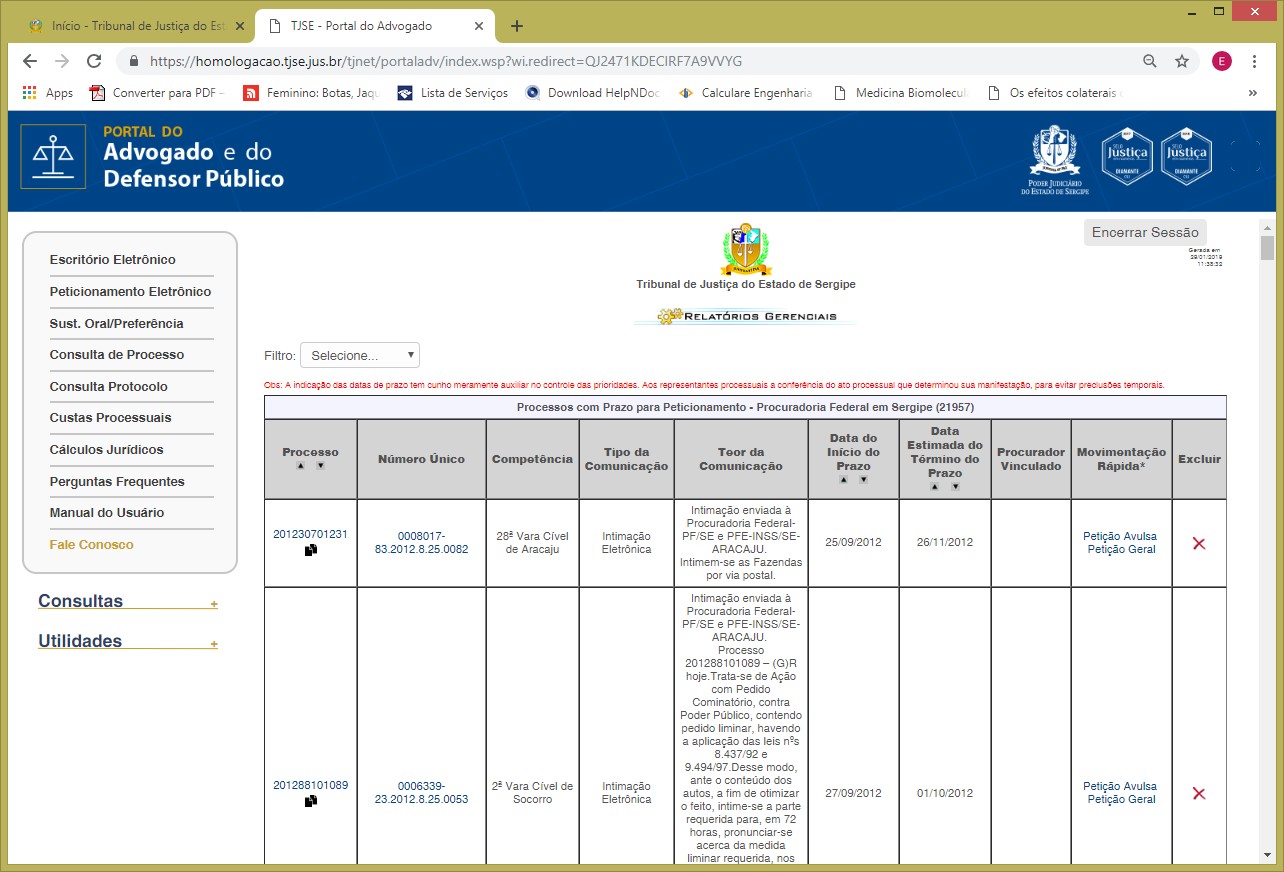 Finalidade: Identificar os processos com intimações e/ou citações eletrônicas expedidas pelo TJSE, com o registro da data estimada para o término de prazo. Com o clique no links 'Petição Geral' e 'Petição Avulsa', o citando/intimando protocola sua petição geral ou avulsa as quais são identificadas pela Secretaria da Unidade Jurisidicional onde tramita o feito.