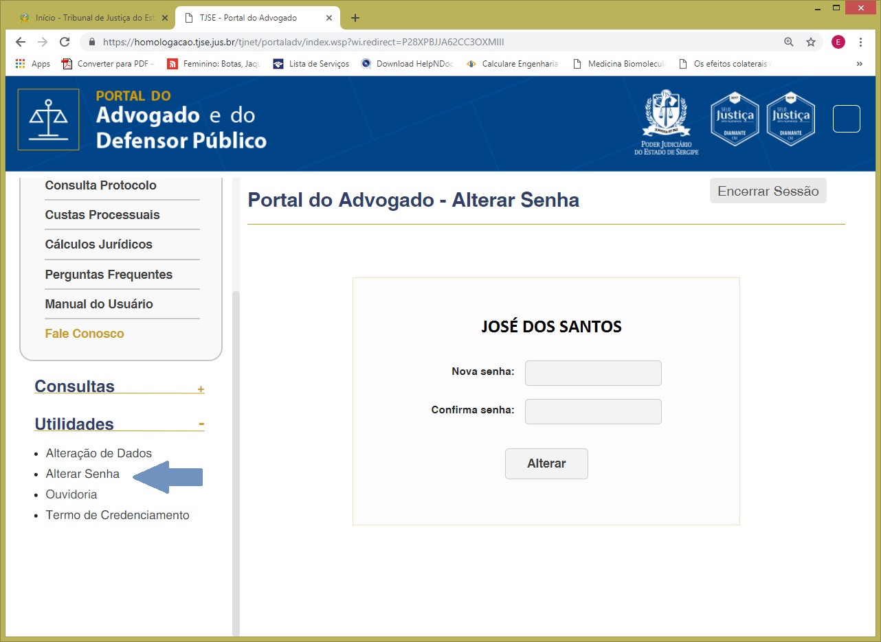 Por meio do menu 'Alterar Senha', o advogado poderá alterar sua senha de acesso ao Portal do Advogado.
