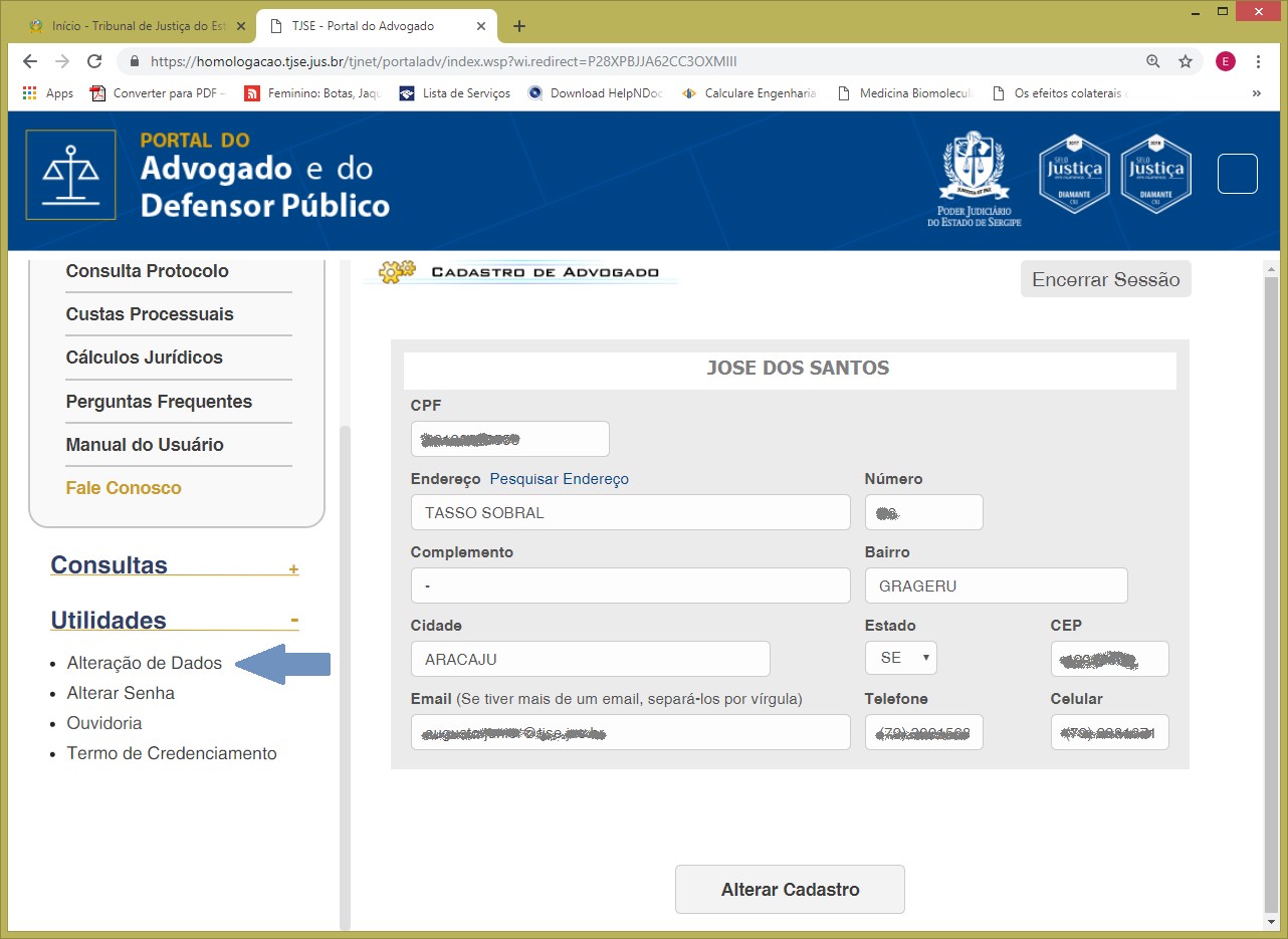 No Portal do Advogado, o advogado poderá alterar seus dados pessoais, tais como endereço, e-mail. Este serviço é realizado através do menu denominado 'Alteração de Dados'. A Alteração de senha é realizada através do menu 'Alterar Senha'.