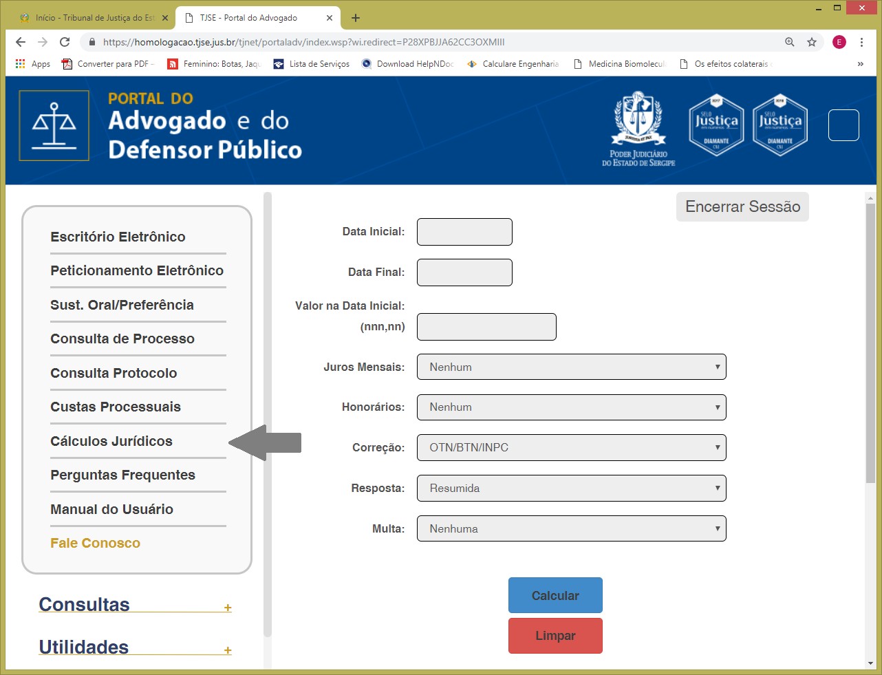 No Portal do Advogado está disponbilizado o cálculo automatizado de atualização monetária, acessado através do menu 'Cálculos Jurídicos', ver figura abaixo.