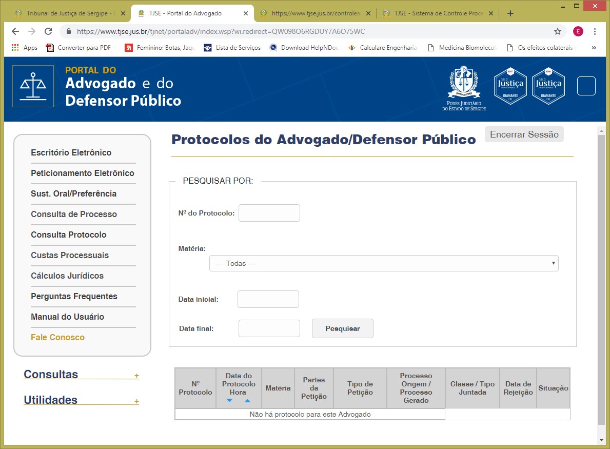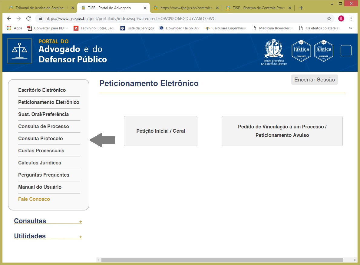 Os protocolos eletrônicos de petição inicial e geral poderão ser consultados no Portal do Advogado através do menu denominado 'Consulta Protocolo (ver figura baixo). Vejamos abaixo o passo a passo: