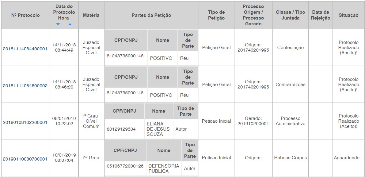 Passo 2: É exibida a página com os protocolos do advogado. Na coluna 'Situação', serão apresentados os protocolos eletrônicos que estão aguardando aceitação, os aceitos e os rejeitados pelo Distribuidor (cor vermelha). Para verificar o motivo da rejeição do protocolo, o advogado deverá clicar no número do protocolo (primeira coluna).