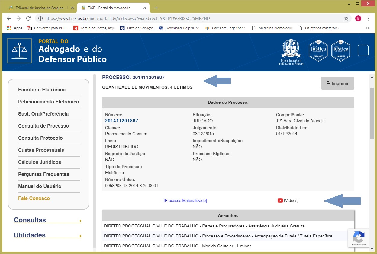 Será disponibilizada a página de consulta ao processo, com os dados do processo, movimentos processuais e os links para consulta de processo materizado e vídeos.