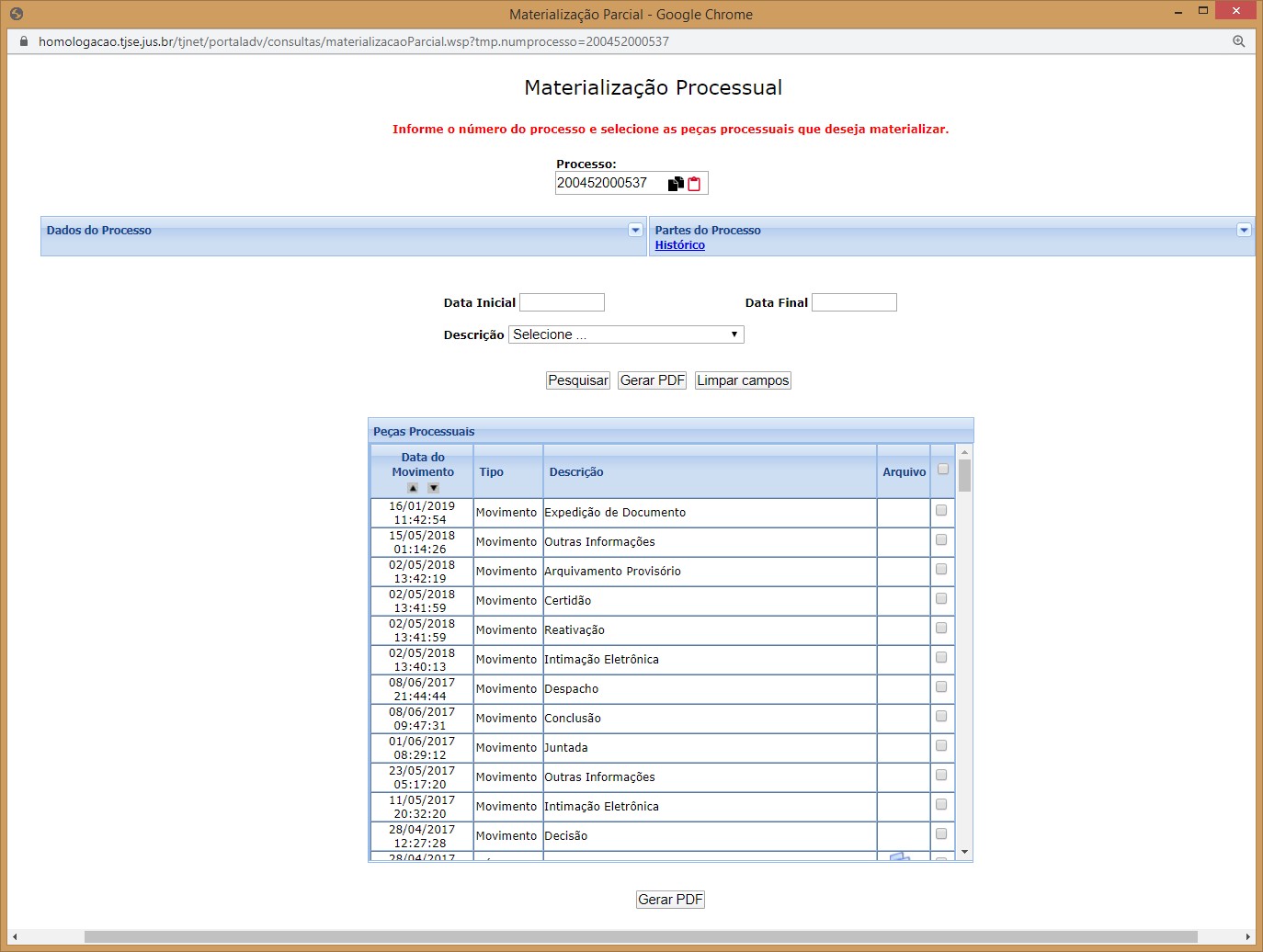 Procedimento: Para a exibição do PDF, o usuário deverá selecionar o tipo de exibição da consulta: por movimentos lançados no processo (data inicial e final) ou por tipo de movimento (juntada, despacho, decisão etc). Para ambos, deverá selecionar o arquivo (última coluna da figura abaixo). Clicar no botão 'Gerar PDF'.