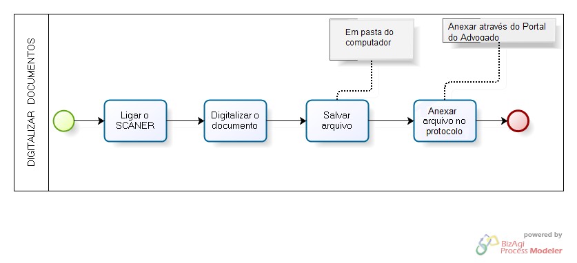 Após a digitalização, o advogado salvará o documento digitalizado em arquivo no formato 'pdf' (Formato de Documento Portável) em seu computador. Feito este procedimento inicial, deve-se acessar o Portal do Advogado para protocolar sua petição inicial/geral e anexar seus documentos digitalizados ao seu protocolo eletrônico.