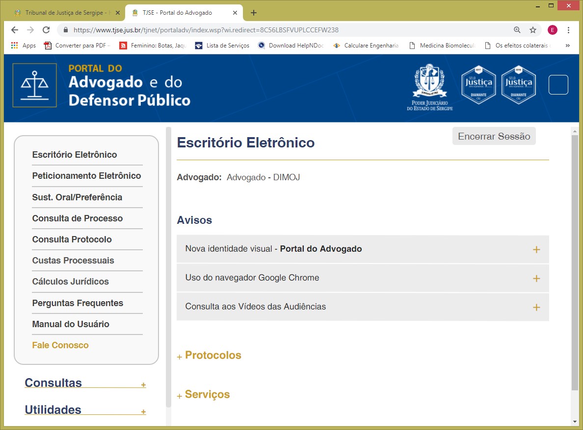 A primeira página do Portal do Advogado foi dada o nome de 'Escritório Eletrônico'. O Escritório Eletrônico corresponde ao ambiente virtual onde o TJSE disponibiliza alguns serviços eletrônicos ao Advogado Público/Privado e Ministério Público (Procuradorias Especializadas). Vejamos abaixo quais são eles: