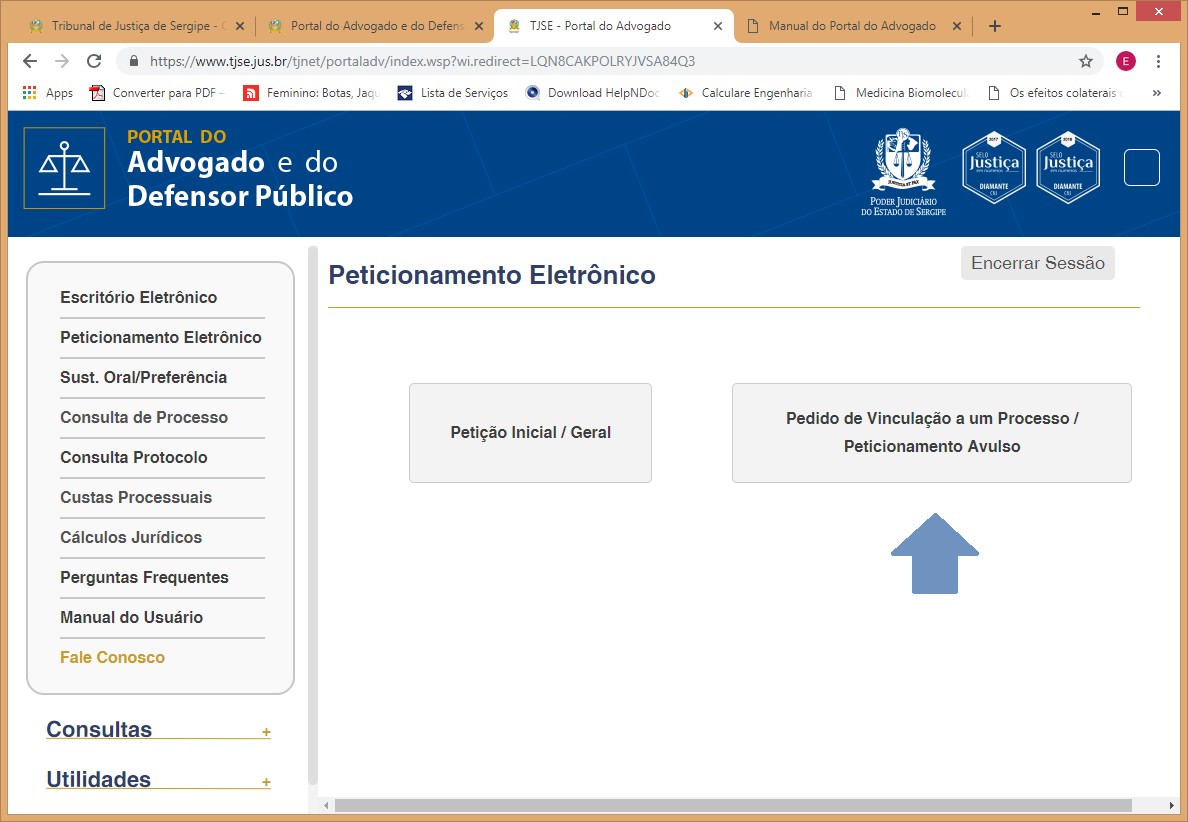 Passo 4. Na página do Portal do Advogado, clicar no botão 'Pedido de Vinculação a um Processo / Petição Avulsa'.