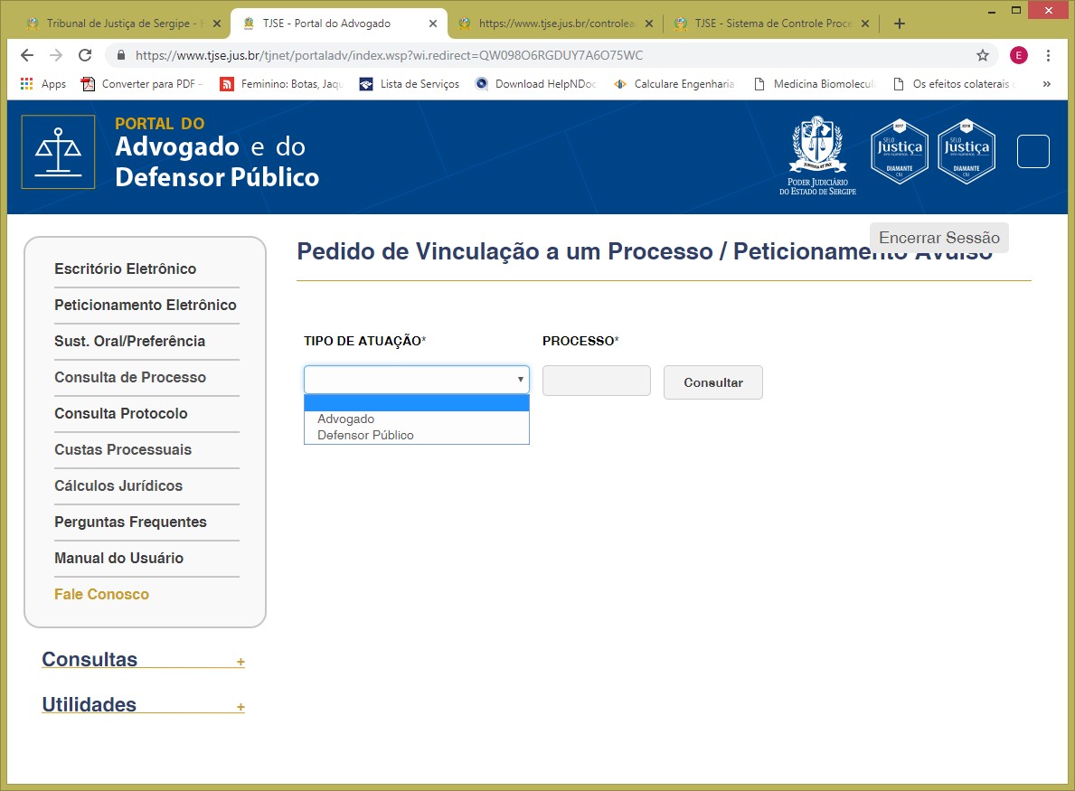 Passo 5: Selecionar o tipo de atuação (procurador, advogado etc) e seguida digitar o número do processo.