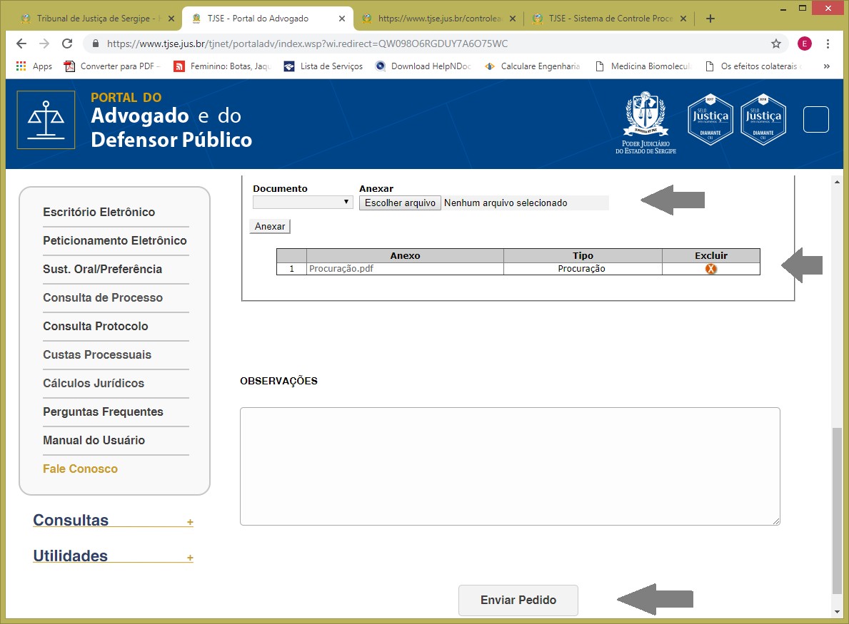 Passo 7: Clicar no botão 'Enviar Pedido', para envio da documentação à Vara de destino. Se solicitada a vinculação, a Secretaria conferirá a procuração a fim de cadastrar o advogado no processo como representante legal da parte.