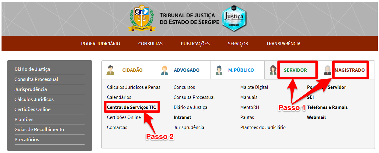 1) Acesse o Sistema da Central de Serviços TIC na Home Page do TJSE (vide imagem abaixo) ou abra o navegador e digite o seguinte endereço (https://centraldeservicostic.tjse.jus.br/):