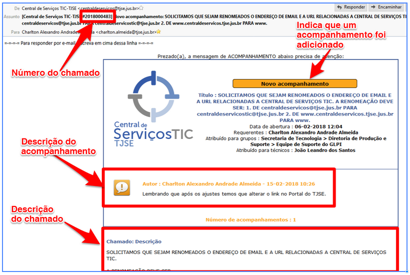 Quando um requerente ou técnico adiciona um novo acompanhamento a um chamado, automaticamente, após alguns minutos, será enviado um email contendo um resumo das informações que foram utilizadas no Acompanhamento. Segue um exemplo de um email deste tipo.