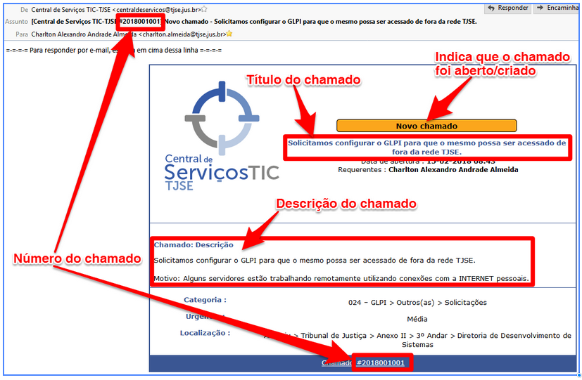 Quando um requerente abre um novo chamado no GLPI, automaticamente, após alguns minutos, receberá um email contendo um resumo das informações que foram utilizadas para abertura do Chamado. Segue um exemplo de um email deste tipo.