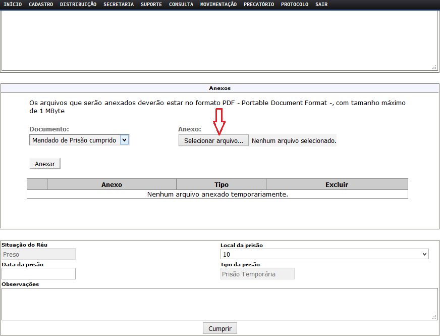 Para registrar o cumprimento na escrivania, o usuário deve acessar o menu Movimentação>>Prisão e Soltura >> Cumprir.