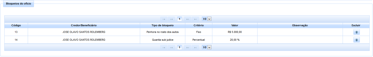 Havendo a necessidade de inclusão de outros bloqueios, basta repetir a operação, sendo, ao final, elencados todos os bloqueios inseridos na tabela avistável na parte inferior da aba em apreço.