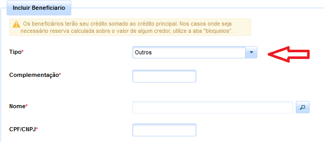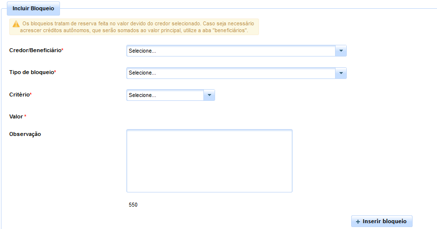 Esta aba destina-se ao registro de eventuais bloqueios, quando for necessária a reserva sobre o valor de um determinado credor. Nas hipóteses em que se revelar necessário o acréscimo de créditos autônomos, que serão somados ao valor principal, deverá ser utilizada a aba "Beneficiários", conforme anteriormente mencionado.