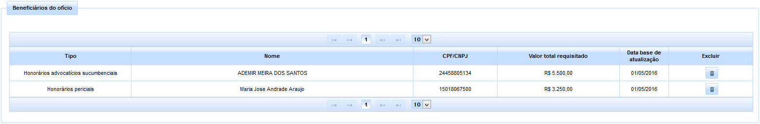 Havendo a necessidade de inclusão de outros beneficiárias, basta repetir a operação, sendo, ao final, elencados todos os beneficiários inseridos na tabela avistável na parte inferior da aba em apreço.