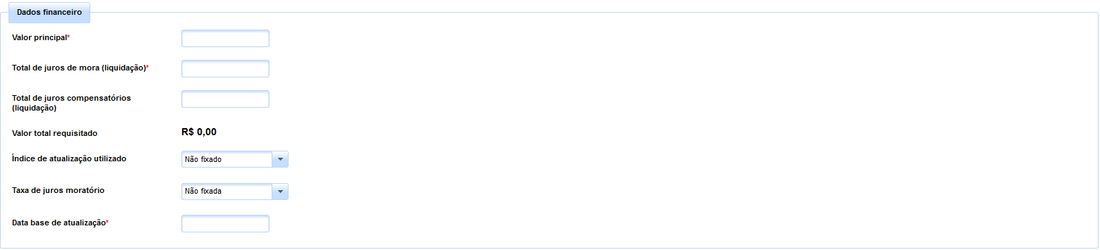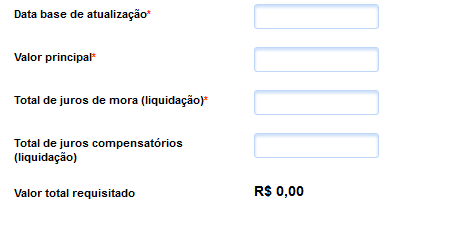 Em seguida, deverá o usuário informar os dados financeiros do crédito executado, entre eles, o valor principal e o total de juros de mora e de juros compensatórios já aferidos em liquidação ou por meros cálculos da parte homologados pelo Juízo da execução, sendo obrigatório o preenchimento dos dois primeiros campos.