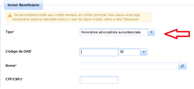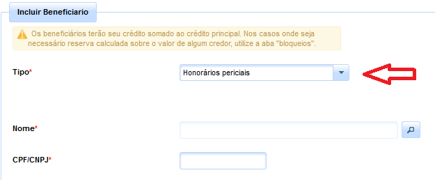 Nesta aba deverão ser indicados eventuais beneficiários do precatório, cujos créditos serão somados ao valor principal executado. Nas hipóteses em que se revelar necessária a reserva sobre o valor de um determinado credor, deverá ser utilizada a aba “Bloqueios”, a ser analisada no subtópico posterior.