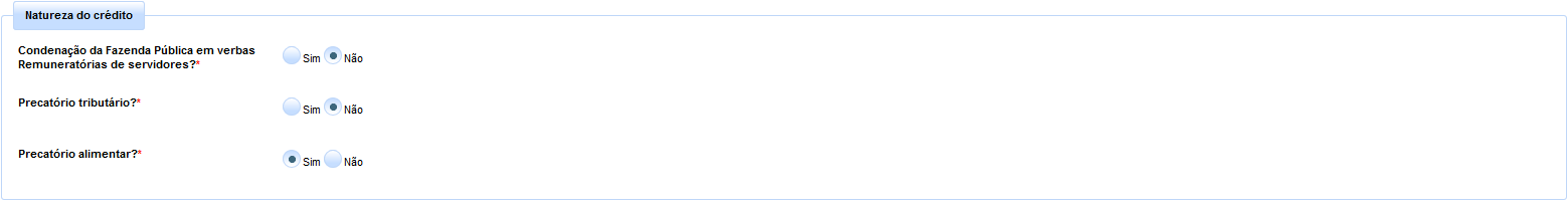 Já em relação à natureza do crédito executado, o sistema exigirá a confirmação se o mesmo decorre ou não da condenação da Fazenda Pública em verbas remuneratórias de servidores, bem assim se versa sobre precatório tributário ou alimentar, devendo o usuário marcar as opções “sim” ou “não”, através dos checkboxes.