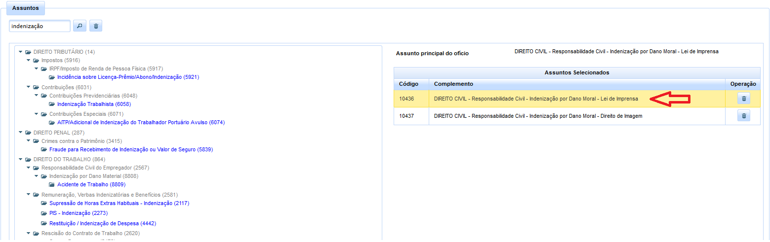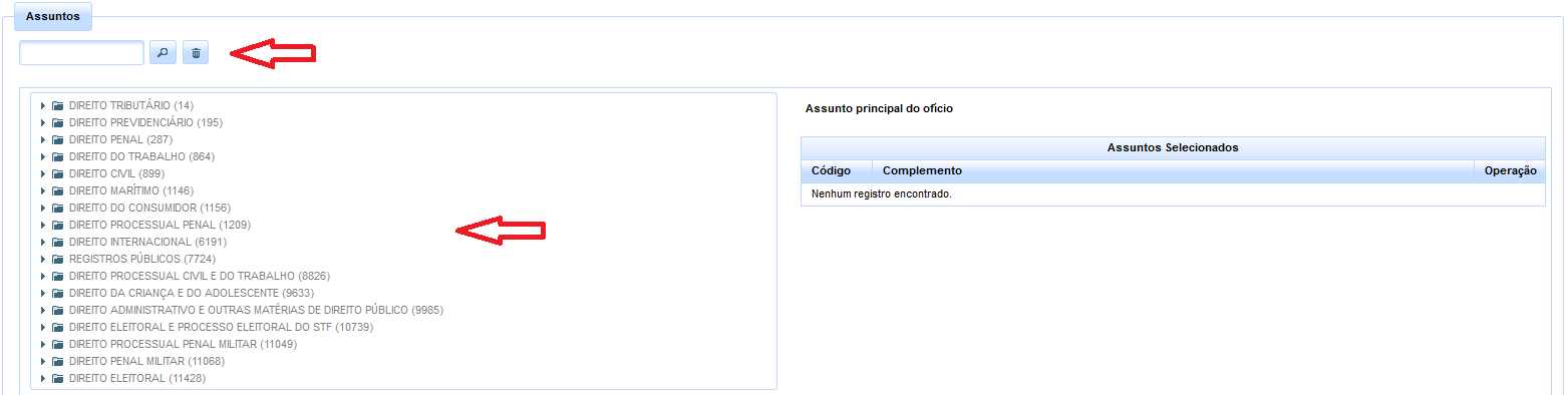 Uma vez selecionado, o assunto é vinculado ao ofício, permitindo-se, se necessário, a escolha de outros assuntos sucessivamente. A escolha, portanto, deve ser feita individualmente, não admitindo o sistema a seleção por grupo de assuntos.