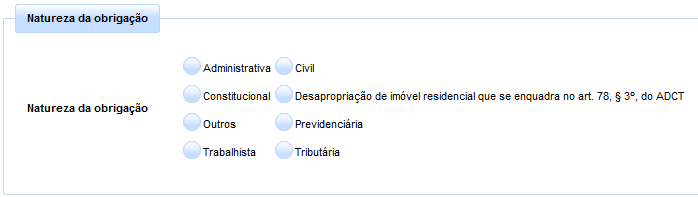 No tocante à natureza da obrigação, o usuário deverá selecionar uma das opções elencadas através dos checkboxes, são elas: Administrativa; Civil; Constitucional; Desapropriação de imóvel que se enquadra no art. 78, §3º, do ADCT; Outros; Previdenciária; Trabalhista; Tributária.