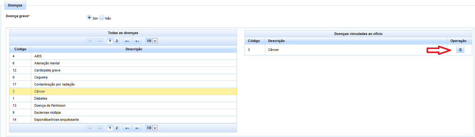 Obs.: Uma vez vinculada a doença, poderá ser a mesma posteriormente excluída clicando-se no botão