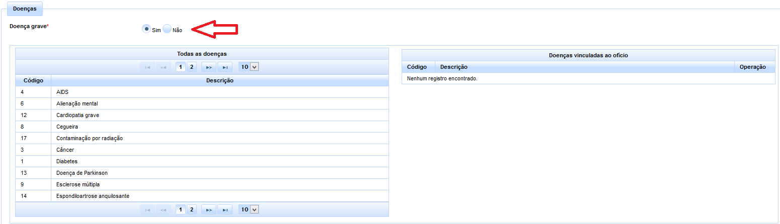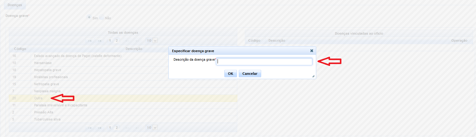 Assim, uma vez reconhecido, mediante requerimento do credor, ser o mesmo acometido de alguma moléstia grave, deverá o usuário selecionar a opção “sim” através dos checkboxes. Em seguida, será solicitada a indicação da(s) respectiva(s) doença(s), bastando clicar sobre a mesma na lista apresentada para que seja devidamente vinculada ao ofício. O sistema admite a múltipla seleção das doenças, prevendo, inclusive, a opção genérica “Outra”, que, uma vez selecionada, abrirá uma caixa de diálogo para a especificação da enfermidade.