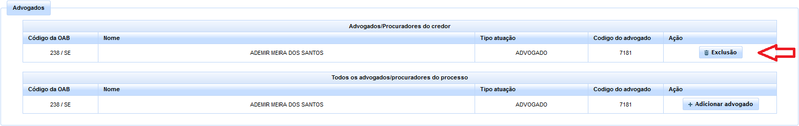 Obs.: Uma vez adicionado, tal qual já se observou em relação à entidade devedora, também poderá ser o advogado posteriormente excluído, clicando-se no botão
