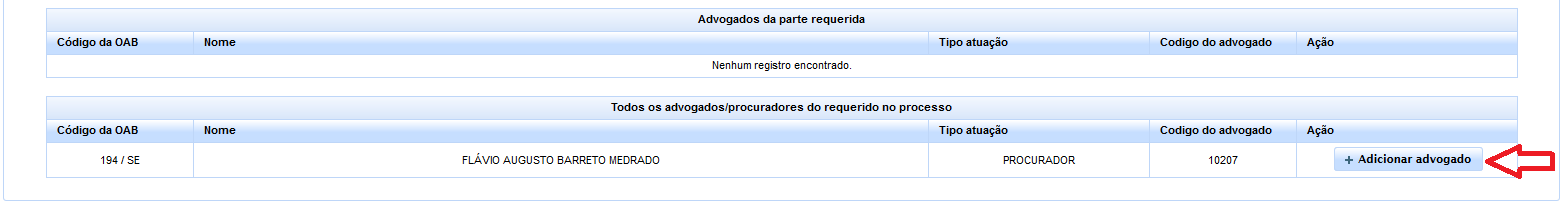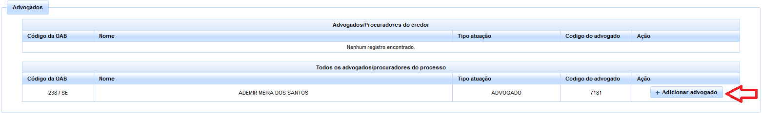 Ato contínuo, deverá o usuário adicionar o advogado/procurador da parte credora, clicando-se no botão