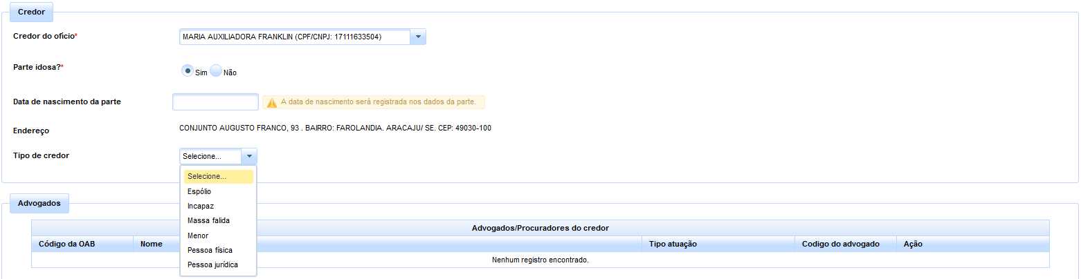 Selecionado o credor, o sistema preencherá automaticamente o endereço constante no seu cadastro e exigirá a confirmação se a parte é idosa ou não através dos checkboxes. Em caso positivo, será solicitada a inserção da respectiva data de nascimento, a qual será também registrada no cadastro da parte.
