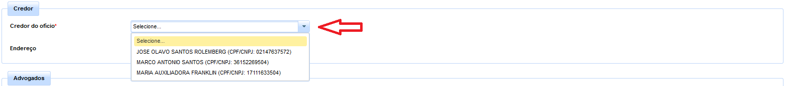 Assim, primeiramente, deverá ser selecionado um único credor em lista cujos valores serão as partes cadastradas no processo de execução informado. Cuida-se de campo de preenchimento obrigatório, permitindo o sistema o cadastro de apenas um credor por ofício, em observância ao disposto no §1º do art. 5º da Resolução nº 115/2010, do Conselho Nacional de Justiça, e na Portaria nº 16/2015 GP1-Normativas-TJSE, que estabelecem que os precatórios devem ser expedidos individualizadamente, por credor, ainda que exista litisconsórcio.
