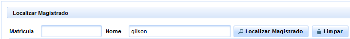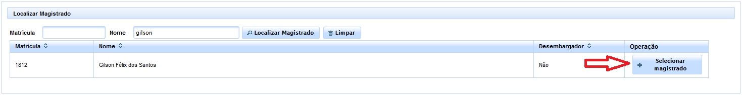 Caso ainda não esteja o Magistrado cadastrado na referida unidade, deverá o usuário localizá-lo através da ferramenta de pesquisa por matrícula ou nome e, em seguida, clicar no botão