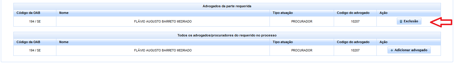 Obs.: Uma vez adicionado, poderá ser o advogado posteriormente excluído clicando-se no botão