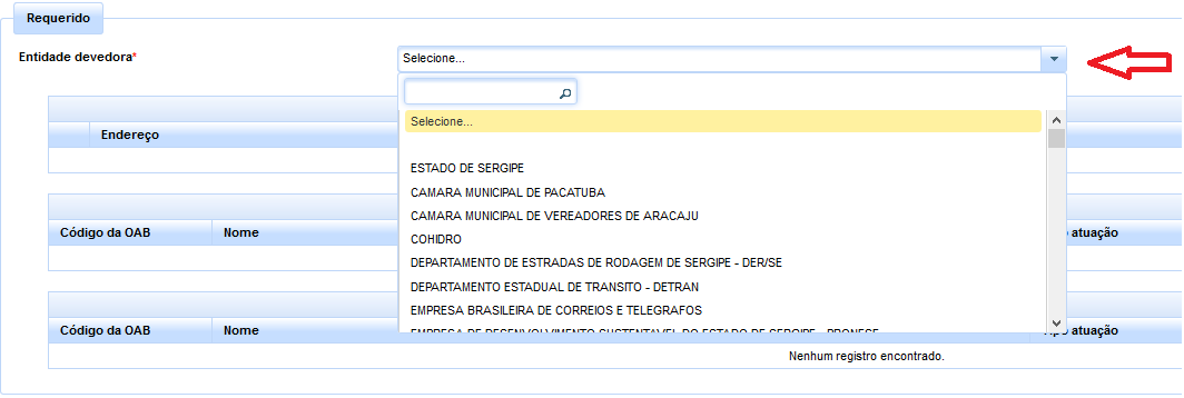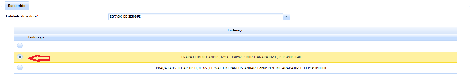 Em seguida, deverá o usuário selecionar a entidade devedora na lista cadastrada pelo Departamento de Precatórios, bem assim o seu respectivo endereço através dos checkboxes.