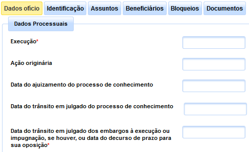 Em seguida, são elencados os campos para preenchimento das informações do ofício, os quais se encontram agrupados em 06 (seis) abas distintas, a saber, “Dados do ofício”, “Identificação”, “Assuntos”, “Beneficiários”, “Bloqueios” e “Documentos”.