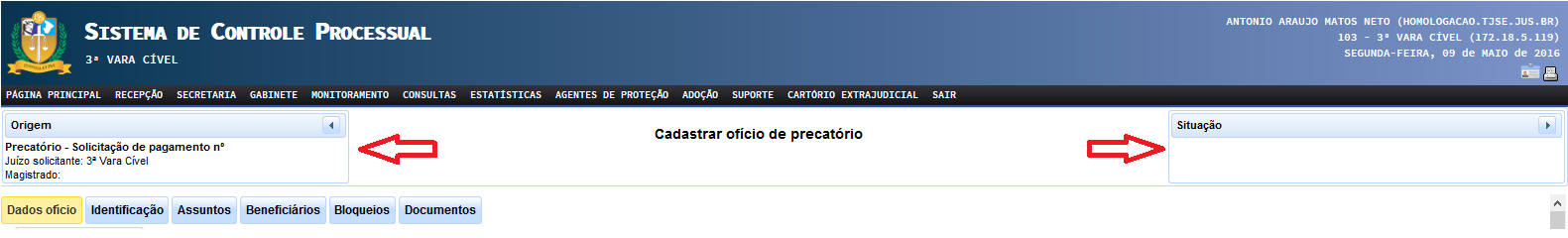 Na caixa situada no canto superior esquerdo são visualizados o número do ofício precatório (gerado somente após a gravação do ofício, ainda que temporariamente), o Juízo solicitante e o respectivo Magistrado. Já a caixa situada no lado direito exibe a atual situação do ofício, de acordo com os estados descritos em tópico próprio, bem como a data e horário de registro da aludida situação.