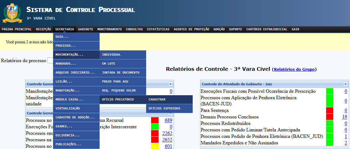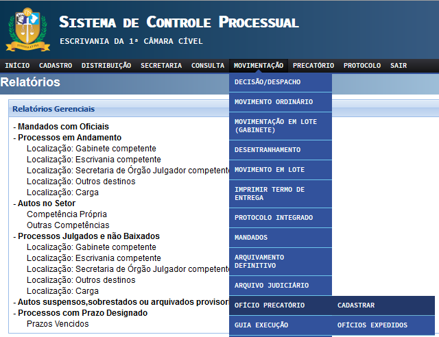Obs.: No Sistema de Controle Processual do 2º Grau (SGrau), a ferramenta para expedição do ofício precatório será acessada selecionando-se a opção “Movimentação” na barra de menu contextual, clicando-se, em seguida, em “Ofício Precatório” e “Cadastrar”.