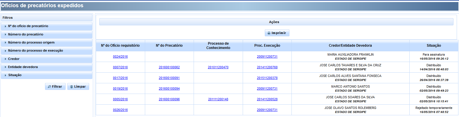 O resultado da filtragem será exibido na tabela visualizada ao lado direito da tela, a qual poderá, inclusive, ser impressa, clicando-se no botão