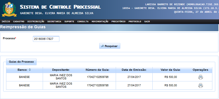 Caso haja necessidade de reimpressão da guia, basta o usuário clicar em 'Movimentação' >> 'Integração bancária' >> 'Guias' >> 'Reimpressão' e digitar o número do processo e clicar em “Pesquisar” e aparecerá a tela com as guias expedidas no processo especificado: