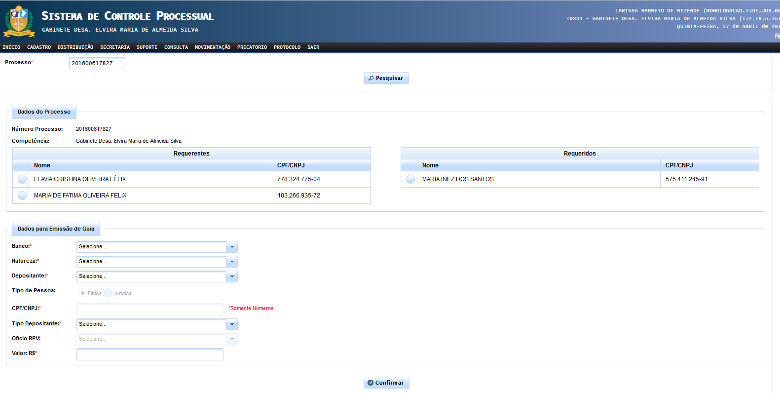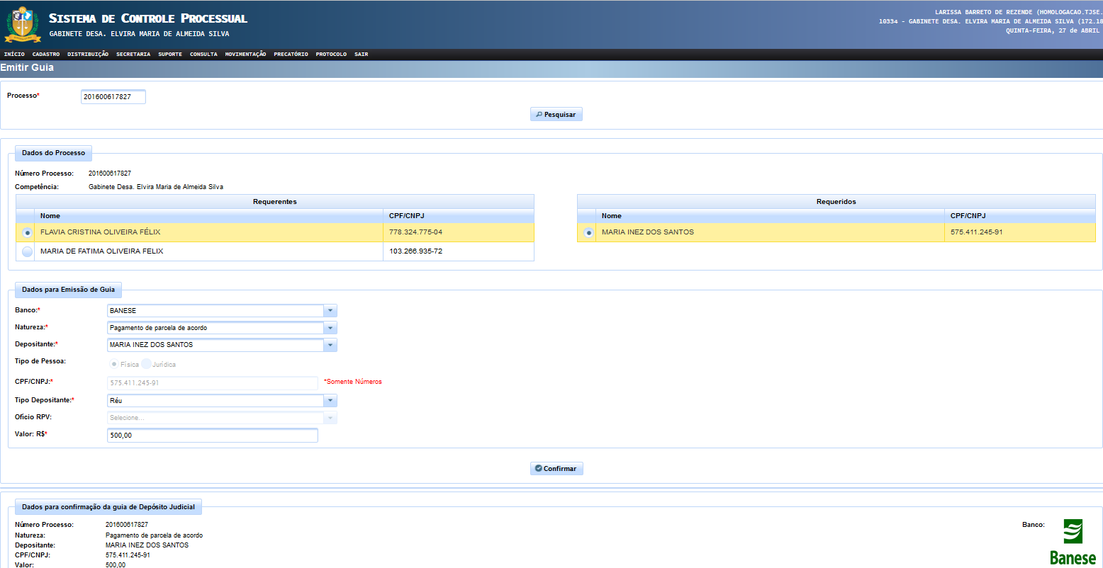 ATENÇÃO!!! É necessário marcar sempre, no campo dados do processo, a parte requerente e requerida, sem o qual a expedição da guia não prosseguirá. Isso serve para fins de cadastro para a criação da conta judicial.
