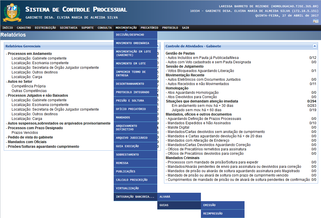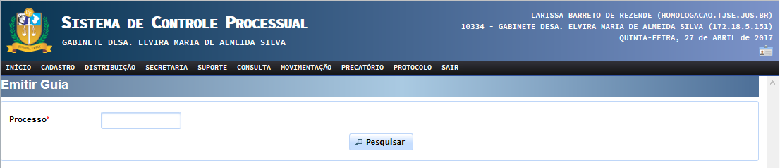 A guia também pode ser gerada através do Sistema de Controle Processual Virtual de 2º Grau. Para geração da guia através da intranet (acesso interno utilizado por servidor do TJSE) o usuário deverá, após entrar com seu login e senha e na respectiva competência acessar 'Movimentação' >> 'Integração Bancária' >> 'Guias' >> 'Emissão':